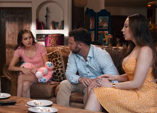 A family of four arrive back at their vacation rental, having spent the day at an amusement park. The stepparents, Laura (Melissa Stratton) and Eric (Seth Gamble), leave to get dinner ready, leaving Jordan (Selena Love) and Oliver (Max Fills), their stepdaughter and stepson (who are also stepsiblings to each other), alone.